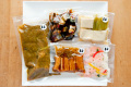 | 内容量 | 穴子と新ごぼう煮(50g)× 1袋、 サーモンマリネ(100g)× 1袋、 高野豆腐とふきの煮もの(120g)× 1袋、 鶏団子の入った茄子のカレー(300g)× 1袋 |