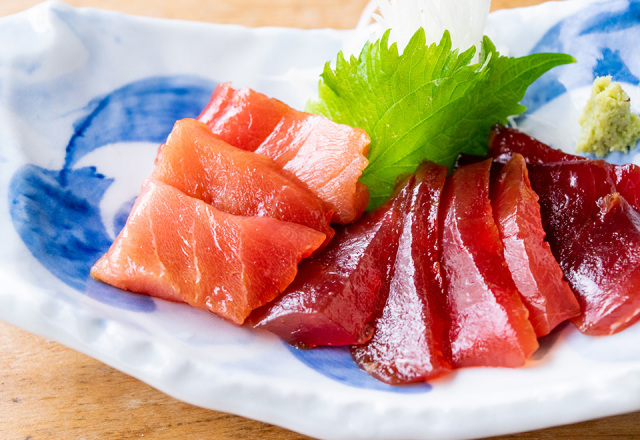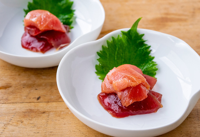 三陸水揚げの目鉢まぐろの切り落としを軽く漬けにしてあります。