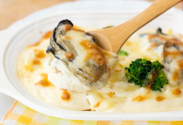 春牡蠣とブロッコリーのクリームグラタンです。食べ応えのある牡蠣が2つ入っています。