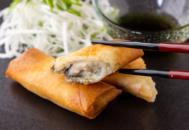 完熟の春牡蠣がまるまる入った春巻きです。蒸した牡蠣だけが入っています。