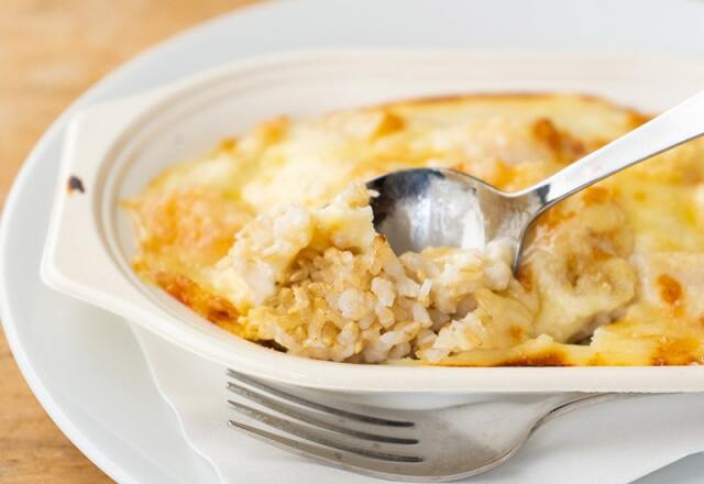 宮城県産玄米・金のいぶき、帆立と海老をドリアにしました。噛み応えのある玄米が噛むとプチプチ味わい深い食感で、ほんのり甘い味わいも美味しいです。