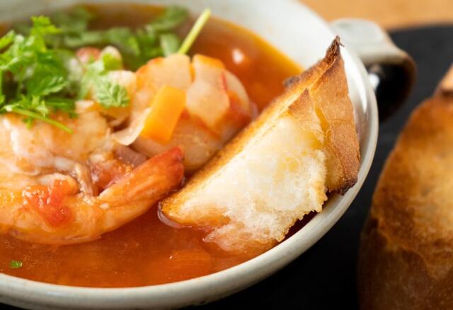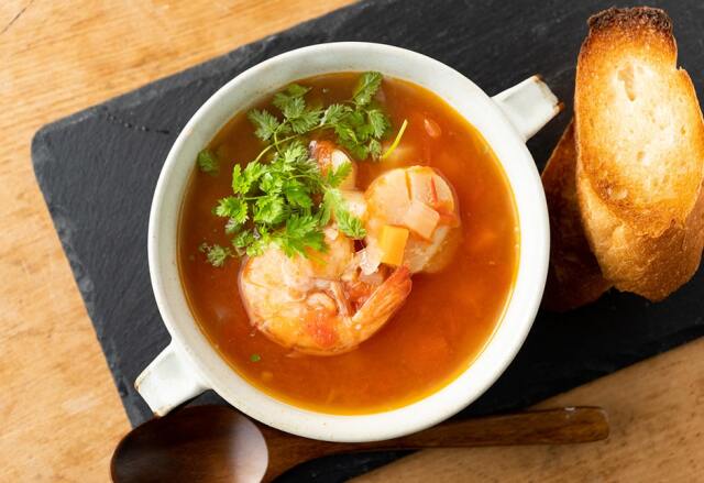 あっさりしてけれど野菜の旨味もたっぷりのミネストローネです。焼いた海老と帆立が入って食べ応えもあります。