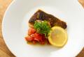 焼き上がりに、今回はダイスカットのトマトに塩一つまみとオリーブオイルをかけたものをあわせました。レモンとチャービルをのせて出来上がりです。