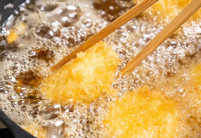 パックに入っているパン粉をもう一度かるく付けなおすような気持ちでパン粉で貝柱を軽く押さえて中温に熱した油で揚げて下さい。