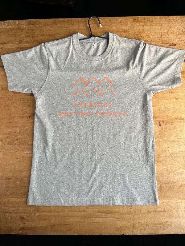 通販でもおなじみのバタークッキーのデザインのTシャツです。モンベル社のペアスキンコットン素材で適度な厚みと綿100%で肌馴染みがよいです。