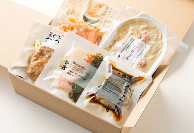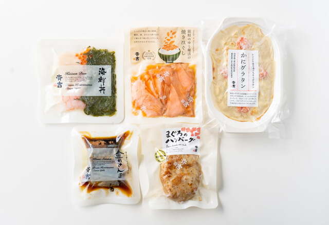 | 内容量 | 金のさんま(2切入)×1P、銀鮭のゆう庵漬け焼きほぐし×1P、斉吉海鮮丼(甘えび)×1P、かにグラタン×1P、まぐろハンバーグ×1P |