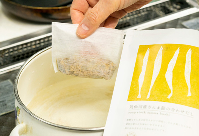 出汁パックを水から鍋に入れ、沸騰したら弱火で5〜7分煮出して頂ければすぐにお使い頂けます。