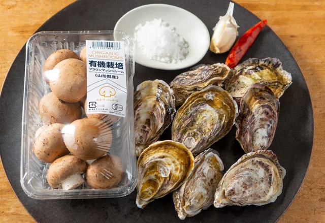 宮城のシングルシード牡蠣 冷やして生でも、さっと蒸してもどうぞ。山形の舟形マッシュルームのアヒージョとの組み合わせです。週末、美味しいパンを用意してゆったりした食卓にぜひどうぞ。