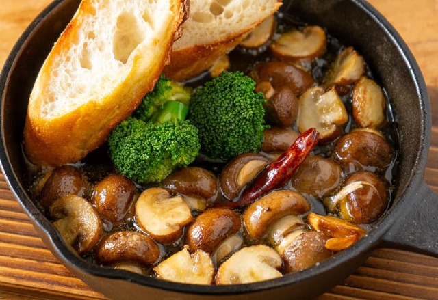 半分づつでもどうぞ。マッシュルームのアヒージョを熱々で