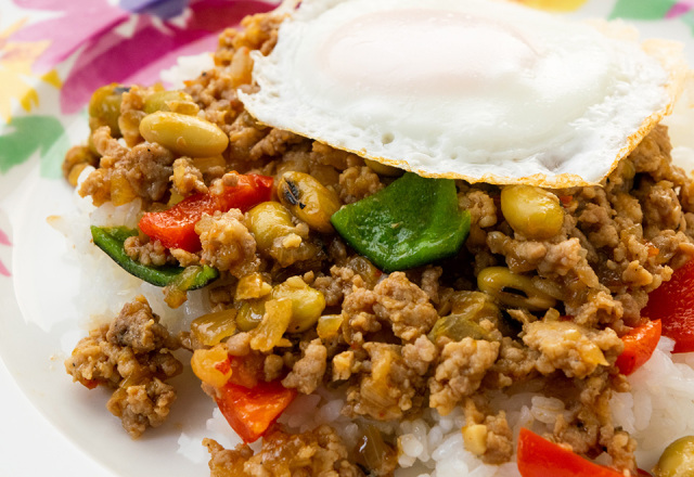 赤色と黄色のパプリカを焼いてたれにからめて肉団子と一緒に食べると見た目もカラフルで、ボリュームもある大満足の一品になります。