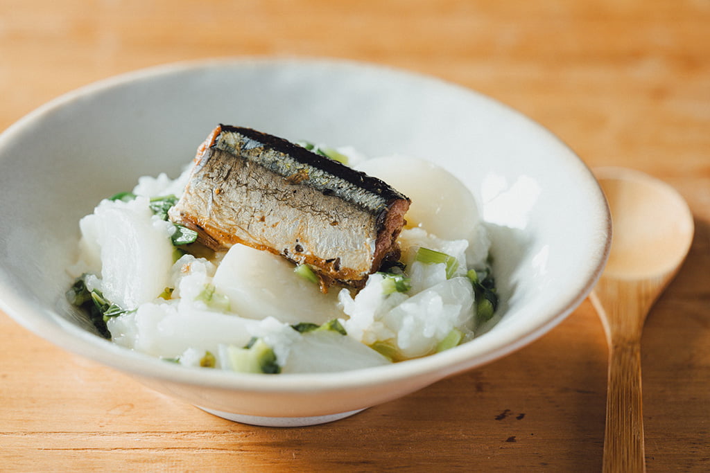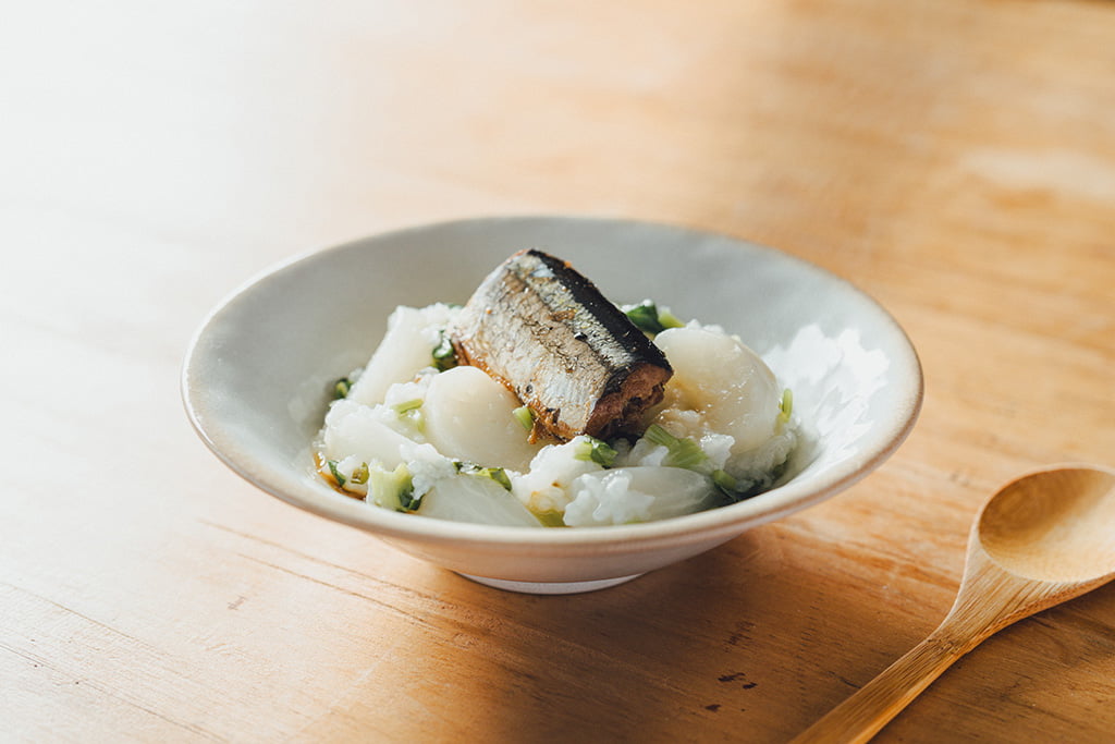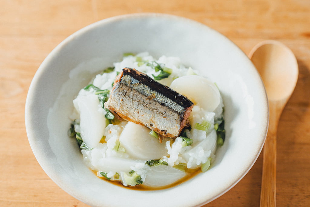 根菜と合わせてお粥を炊いて、仕上げに金のさんまをのせて